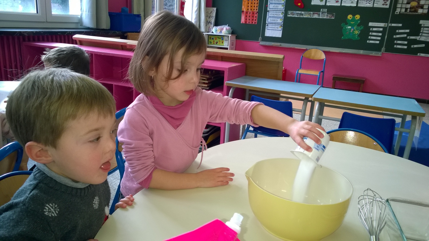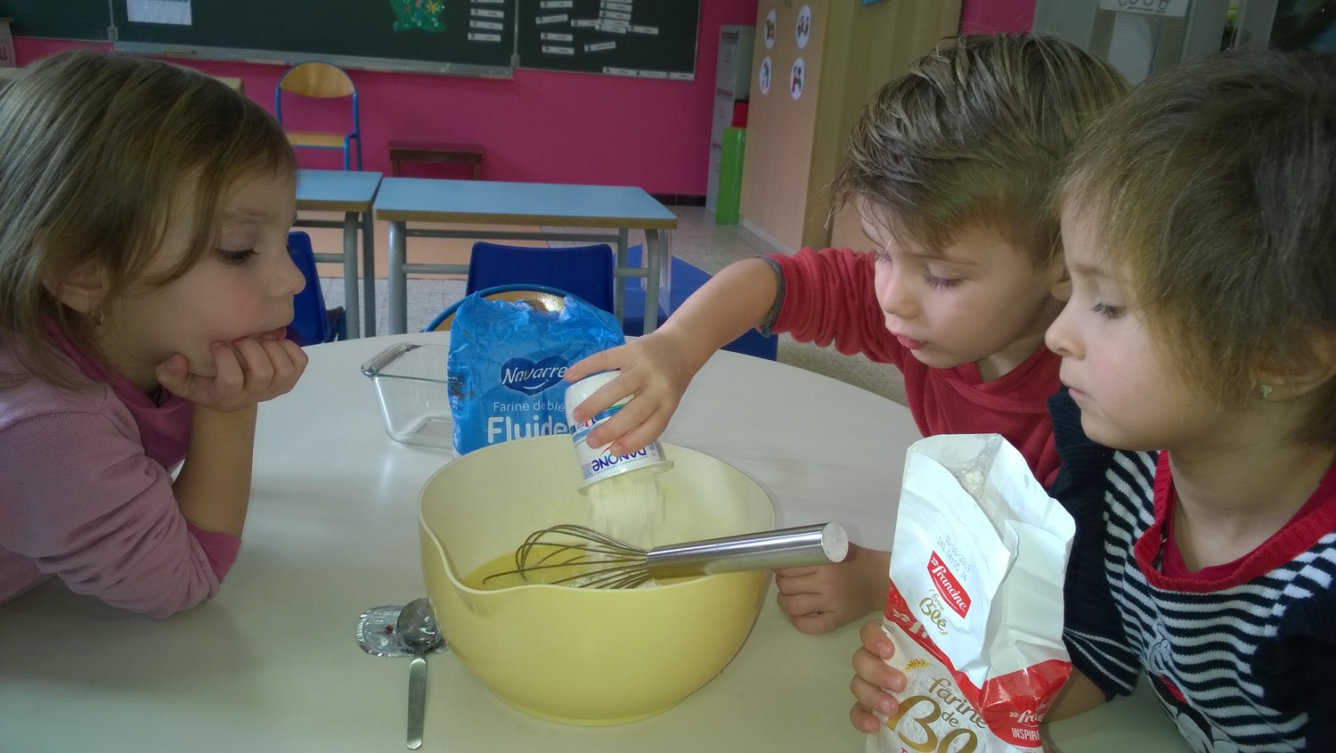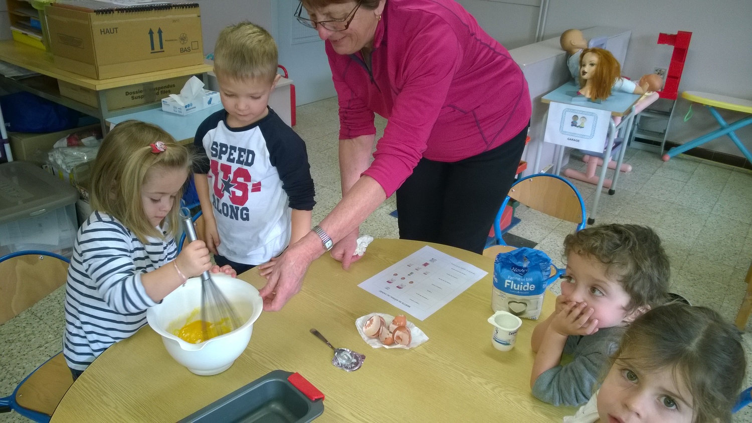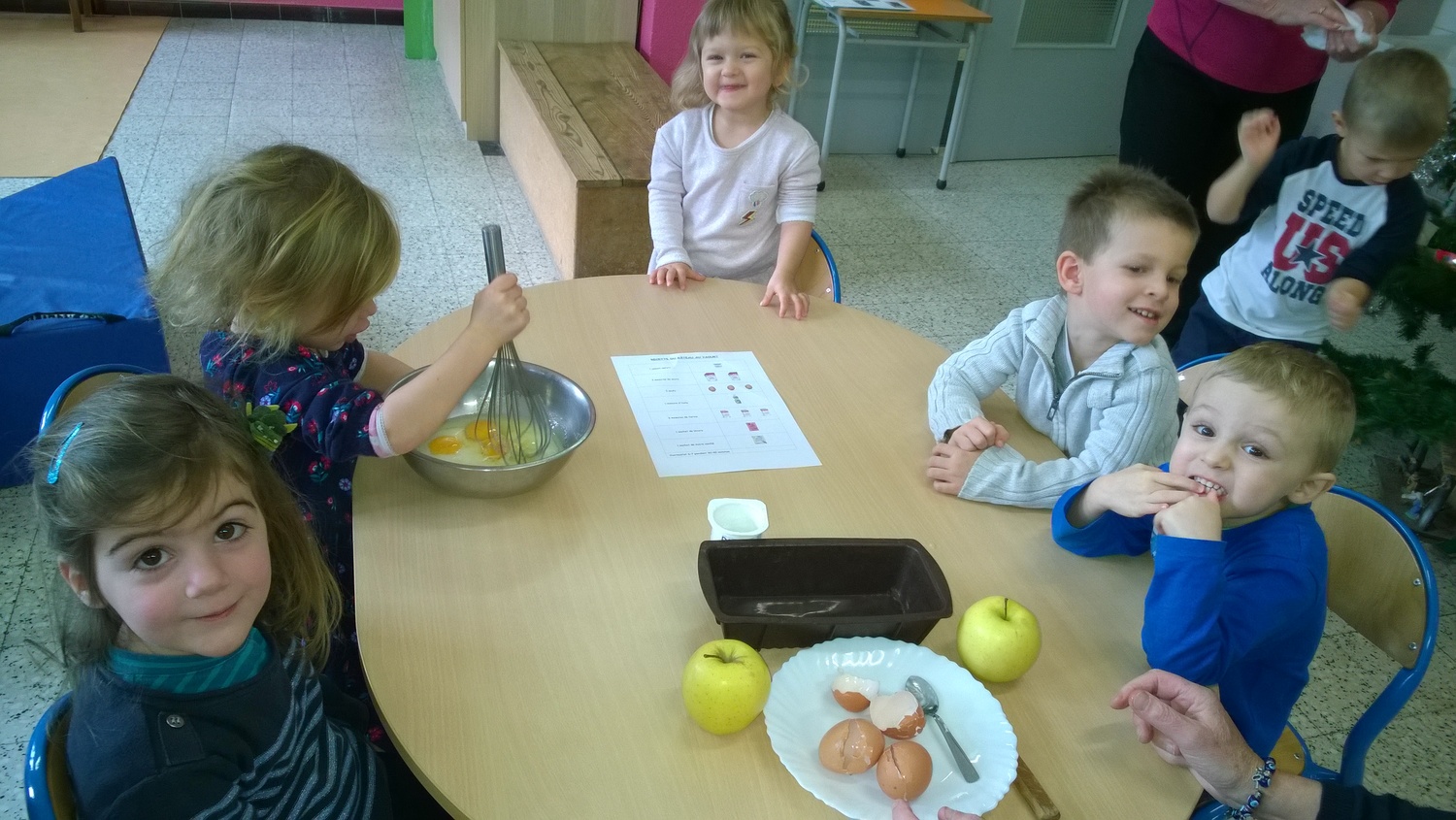 Dans le cadre de notre projet sur l’alimentation, les élèves de PS1-PS2 ont préparé quatre gâteaux au yaourt dont deux aux pommes le jeudi 20 décembre. Nous avons divisé la classe en quatre groupes afin que tous les enfants puissent participer à la confection de ce goûter. Ils ont ajouté les ingrédients, mélangé la préparation et le meilleur pour la fin : ils ont pu lécher le plat ! Nous avons dégusté ce goûter le lendemain matin : miam miam !