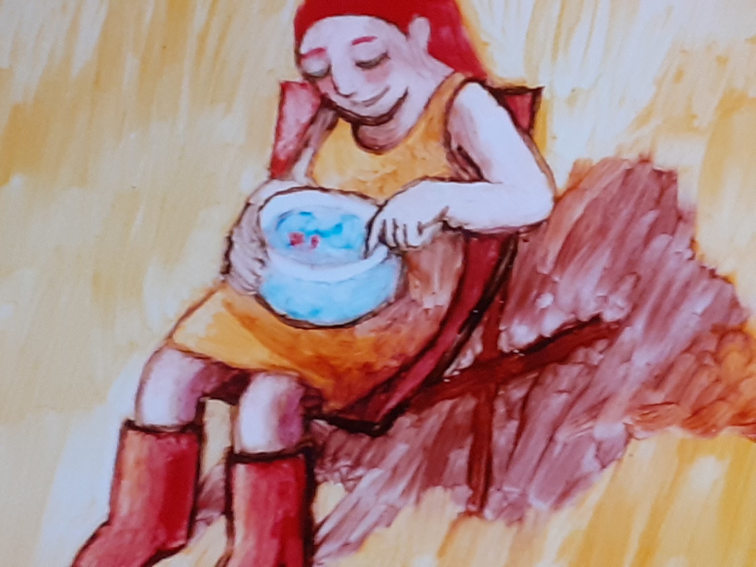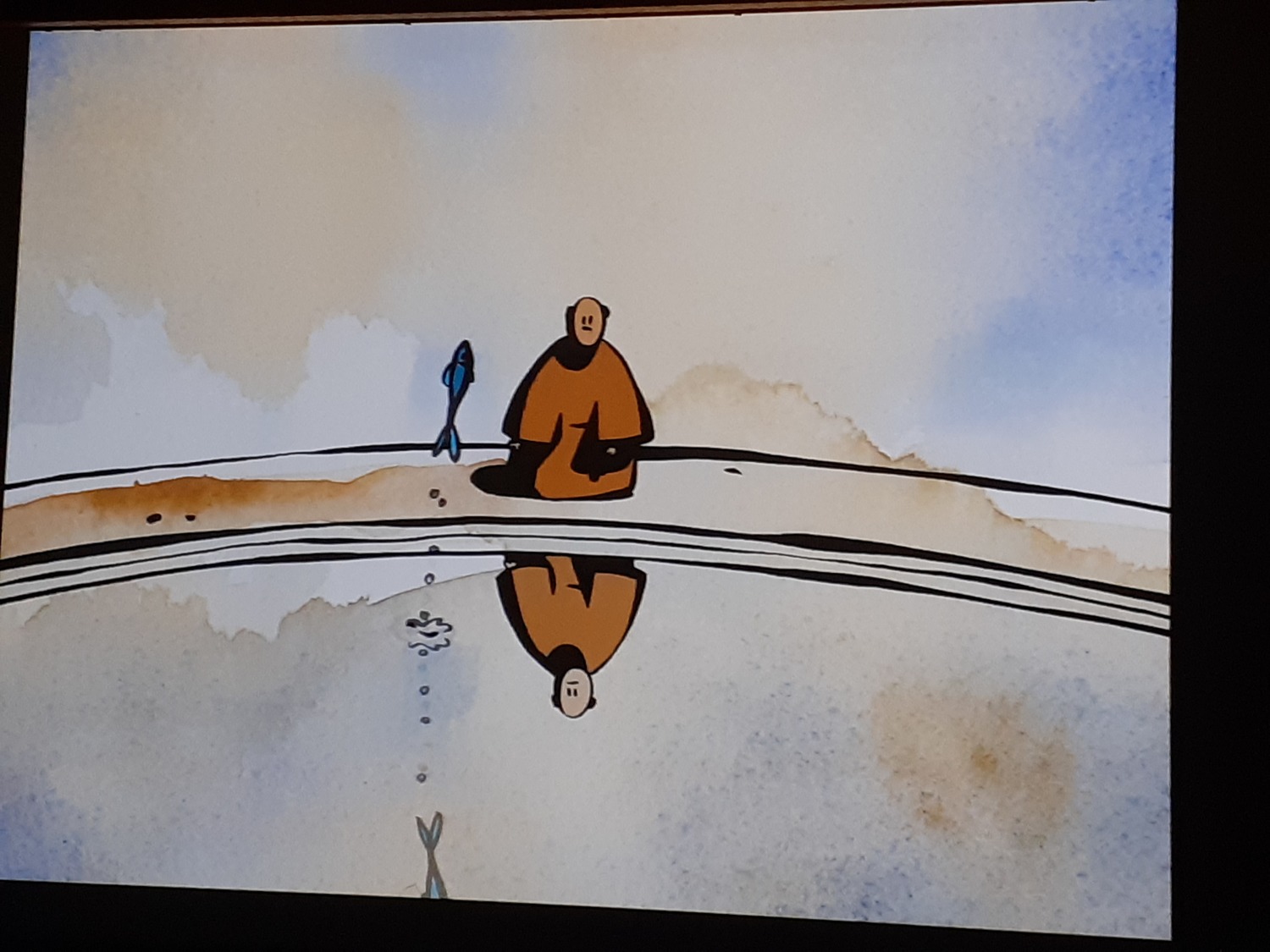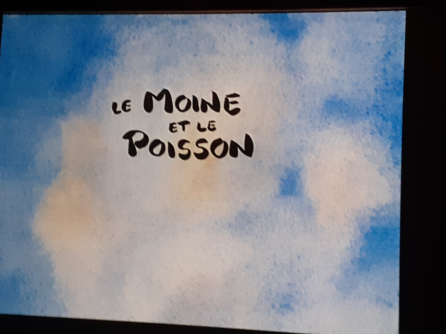 – « Le moine et le poisson » : Le moine n’arrivait pas à attraper le poisson, c’était rigolo : il glissait sur son seau et il tombait dans l’eau. Il faisait des figures drôles.
