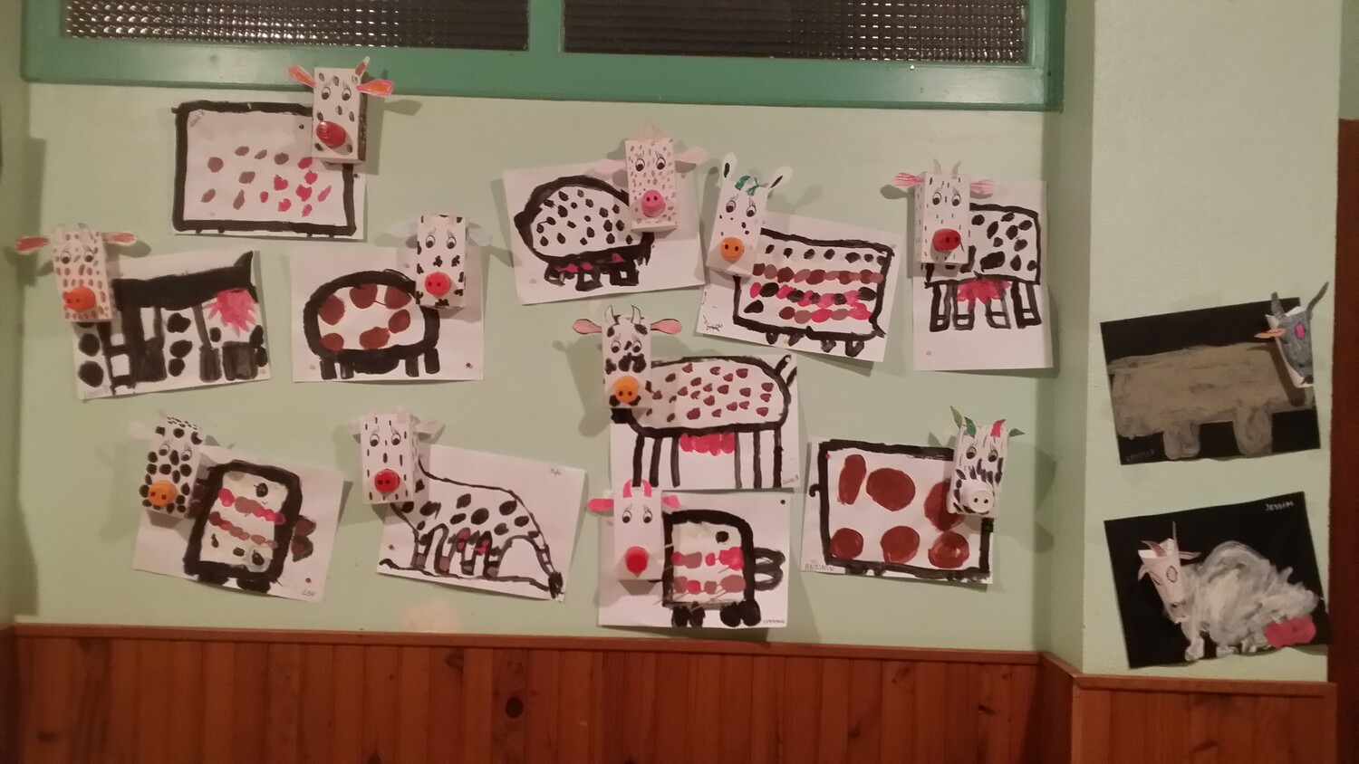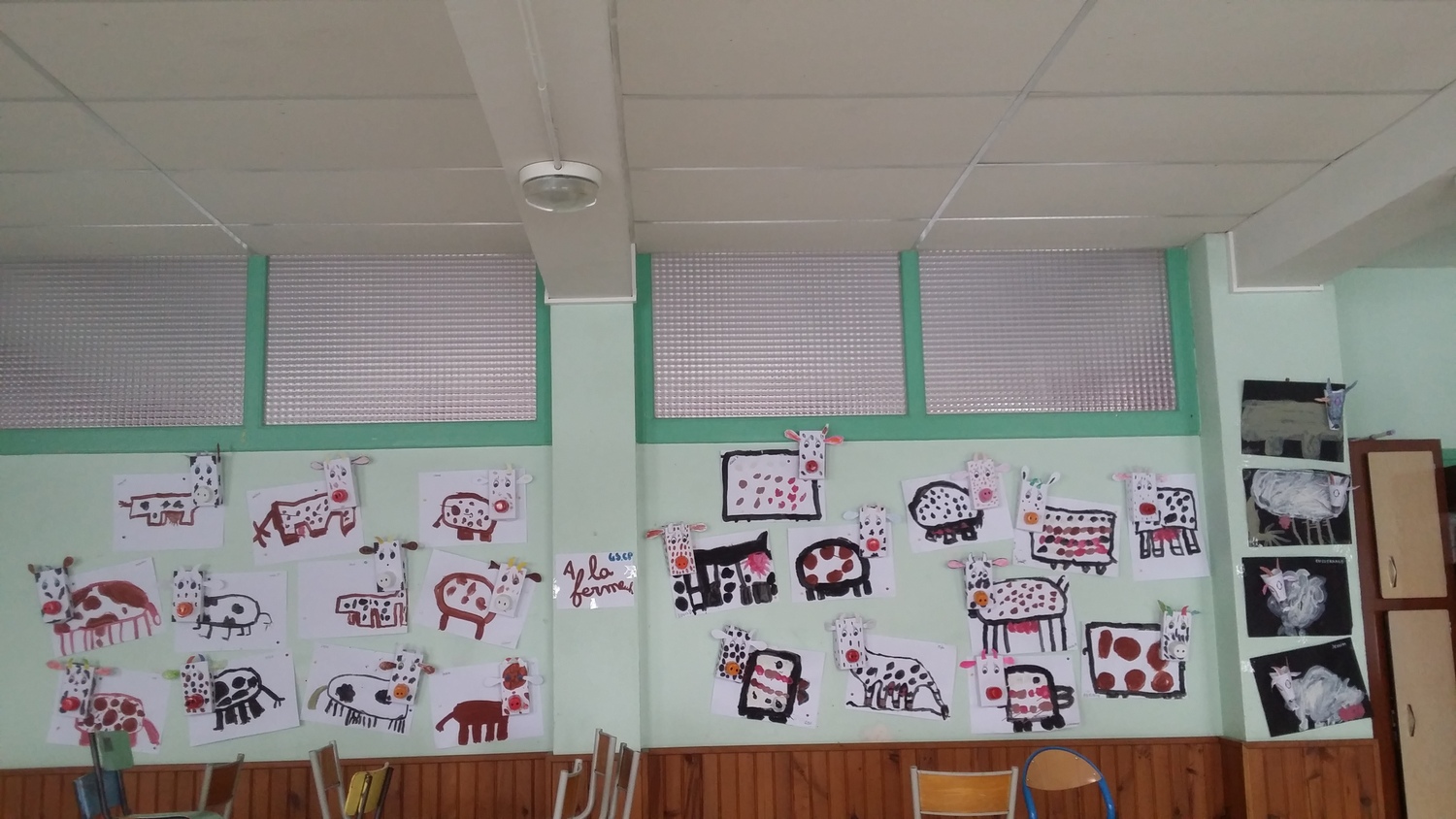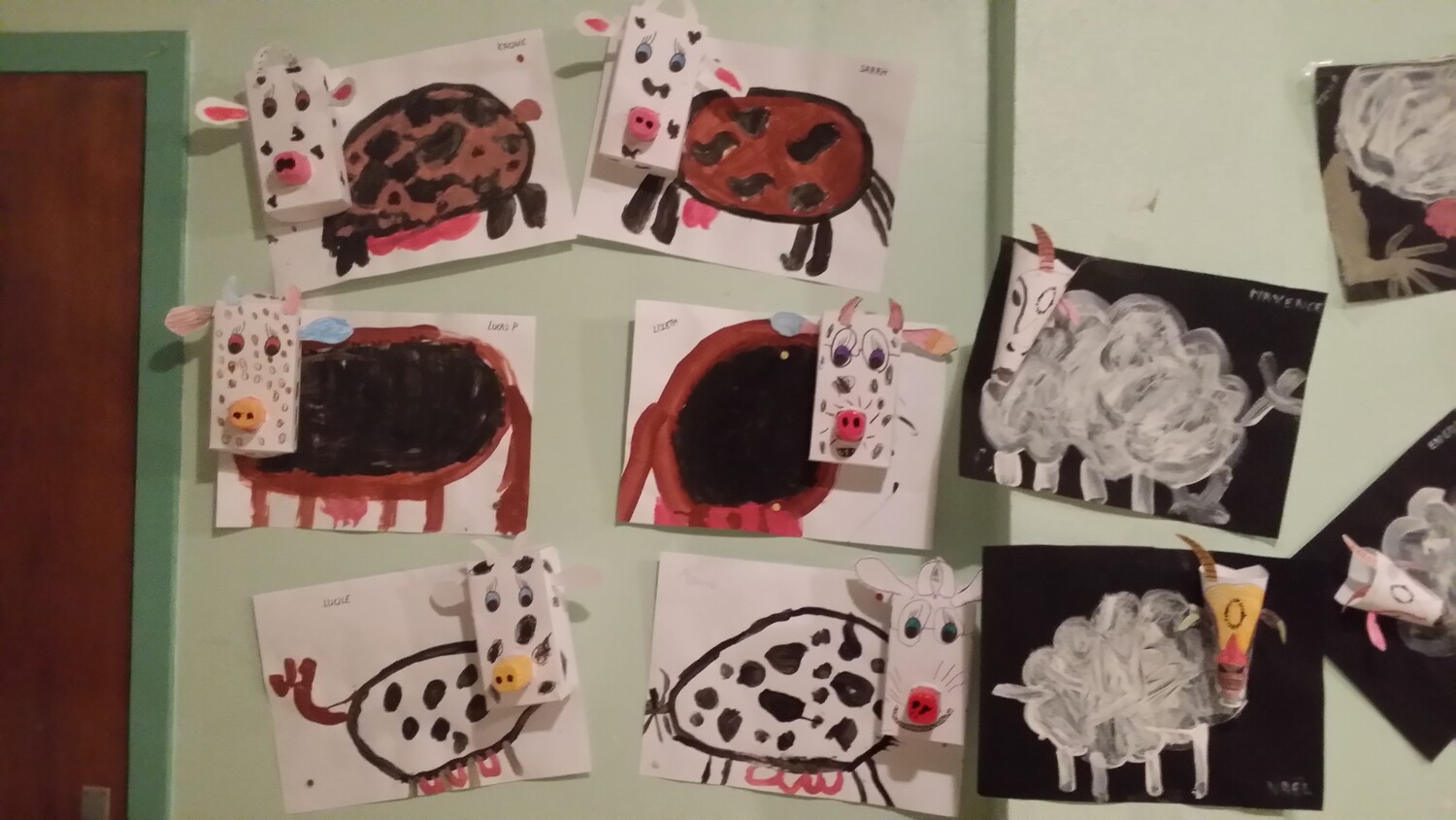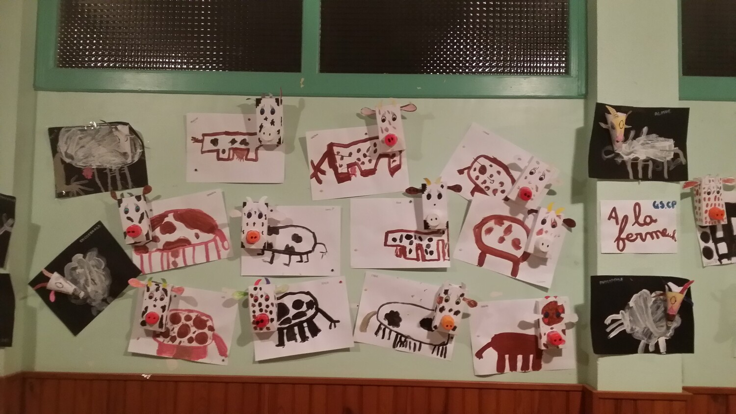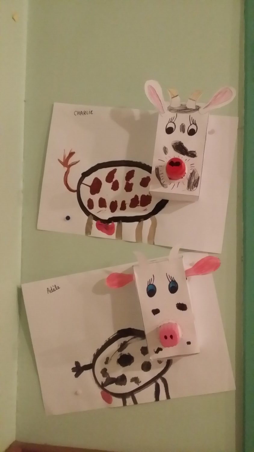 Suite à notre visite au lycée agricole, nous avons réalisé des vaches et des chèvres en bricolage avec les GS de la maîtresse Emmanuelle. Elles sont affichées en salle de garderie.