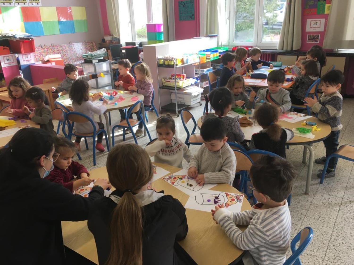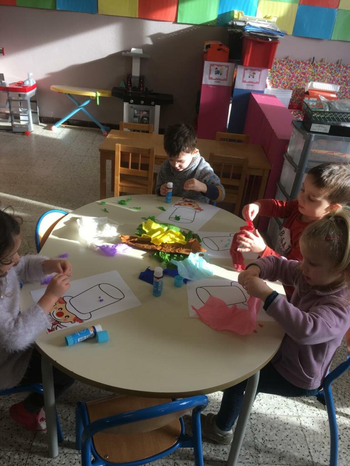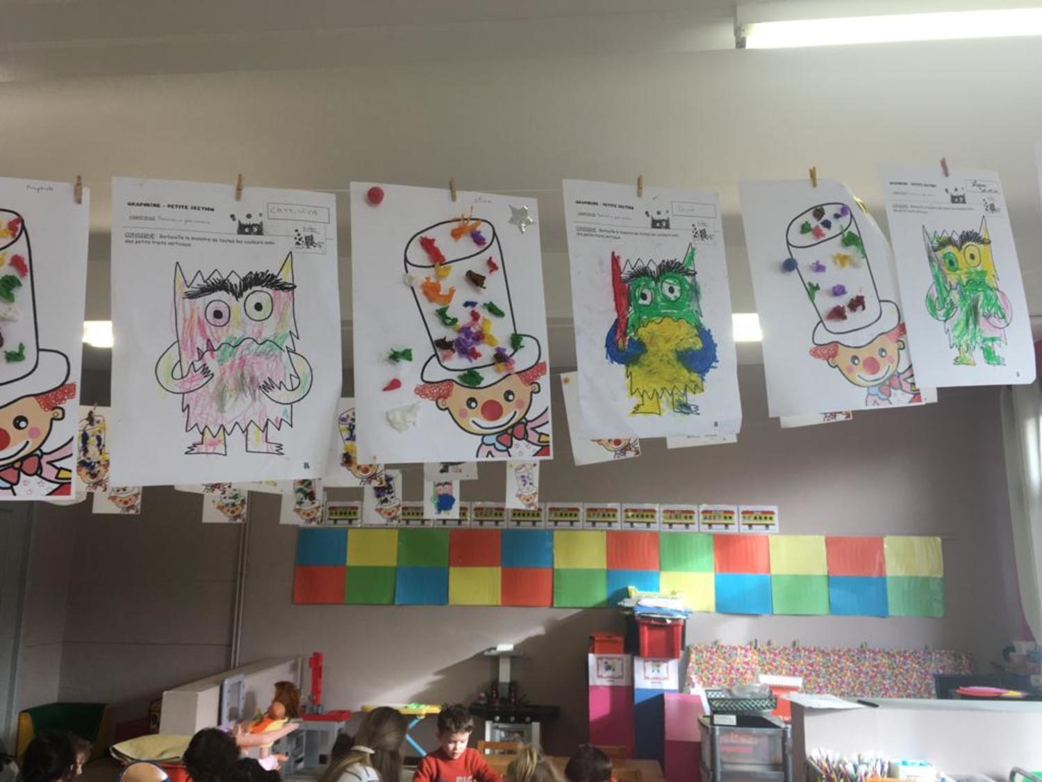 Les élèves de PS1-PS2-MS ont décoré le chapeau d’un clown avec du papier crépon. Et ils ont fait le monstre des émotions avec des craies de toutes les couleurs.
