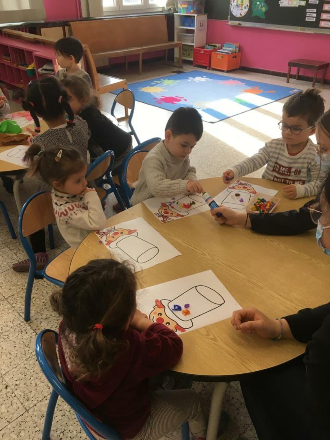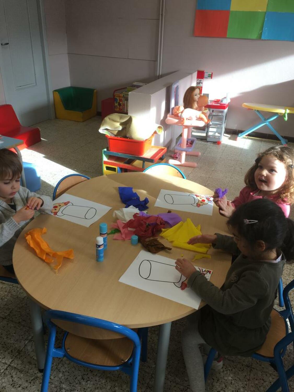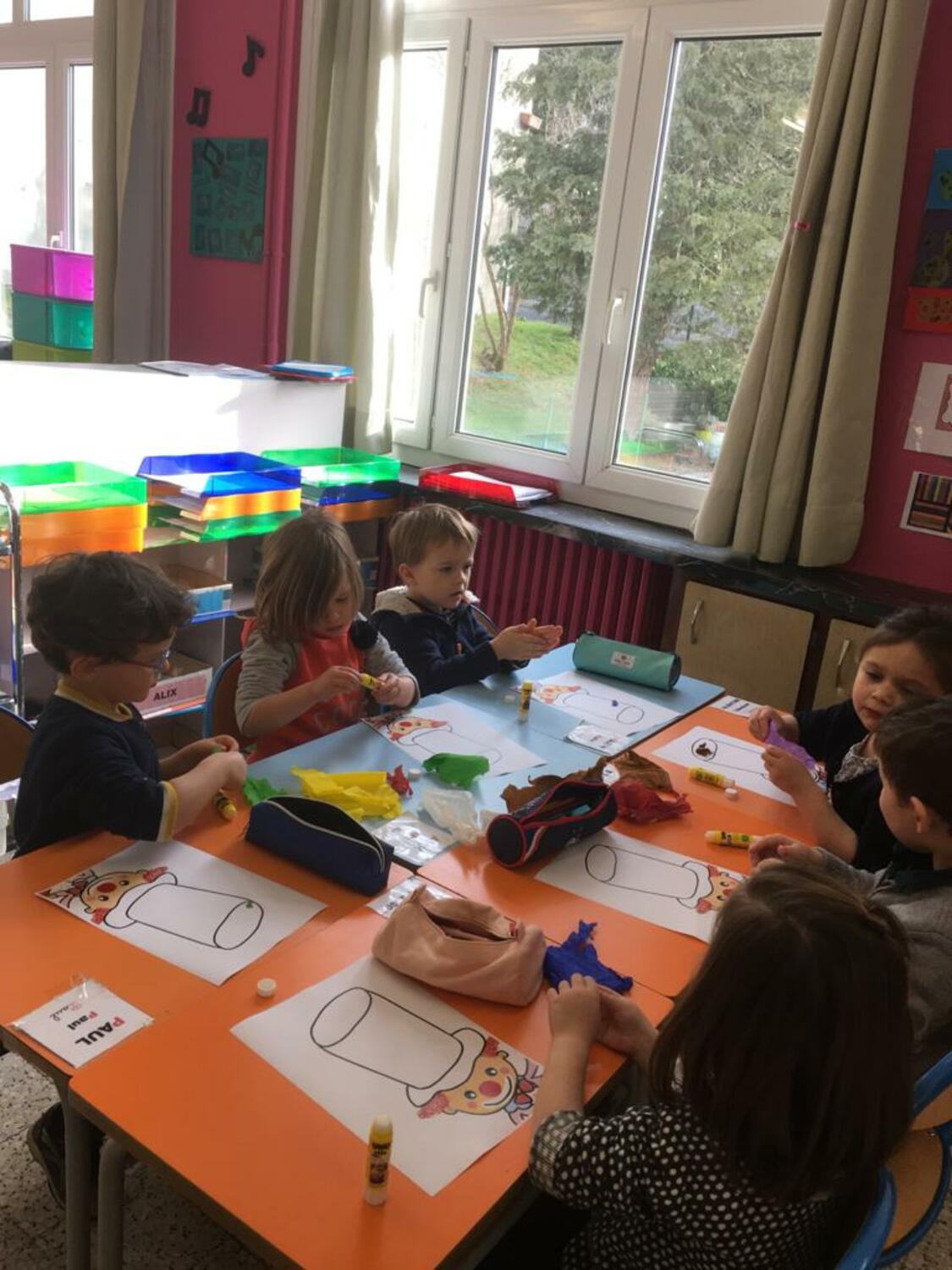 Les élèves de PS1-PS2-MS ont décoré le chapeau d’un clown avec du papier crépon. Et ils ont fait le monstre des émotions avec des craies de toutes les couleurs.