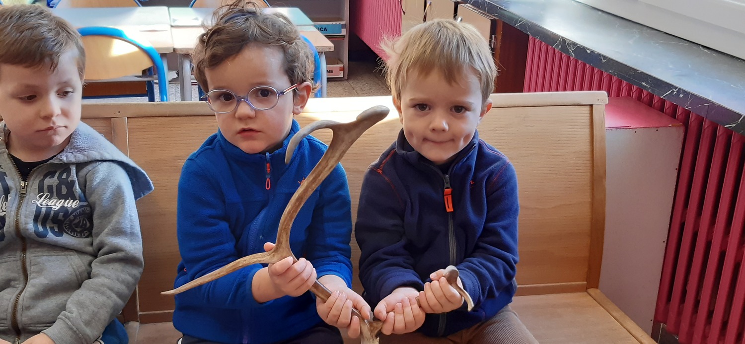 La maîtresse nous a apporté des bois de renne. C’est un ami à elle qui est musher (Un musher est un conducteur de traîneau à neige tiré par un attelage de chiens d’attelage) en Laponie qui les a trouvés par terre car les bois des rennes tombent à l’automne et repoussent. Il était sur les terres du Père Noël. Qui sait, peut-être appartenait il à l’un des rennes du Père Noël ?…
