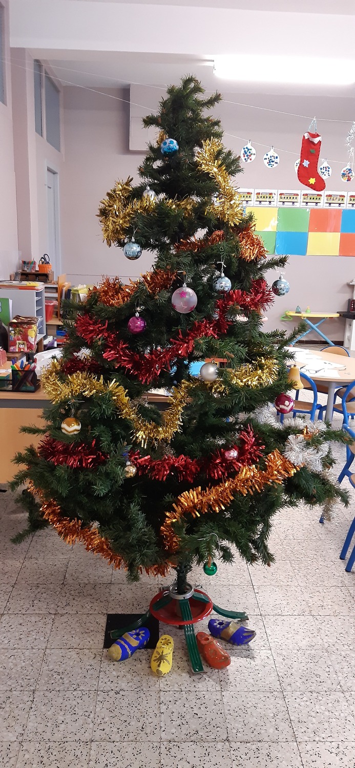 – Un sapin a été décoré avec les guirlandes et les boules apportées par les enfants :