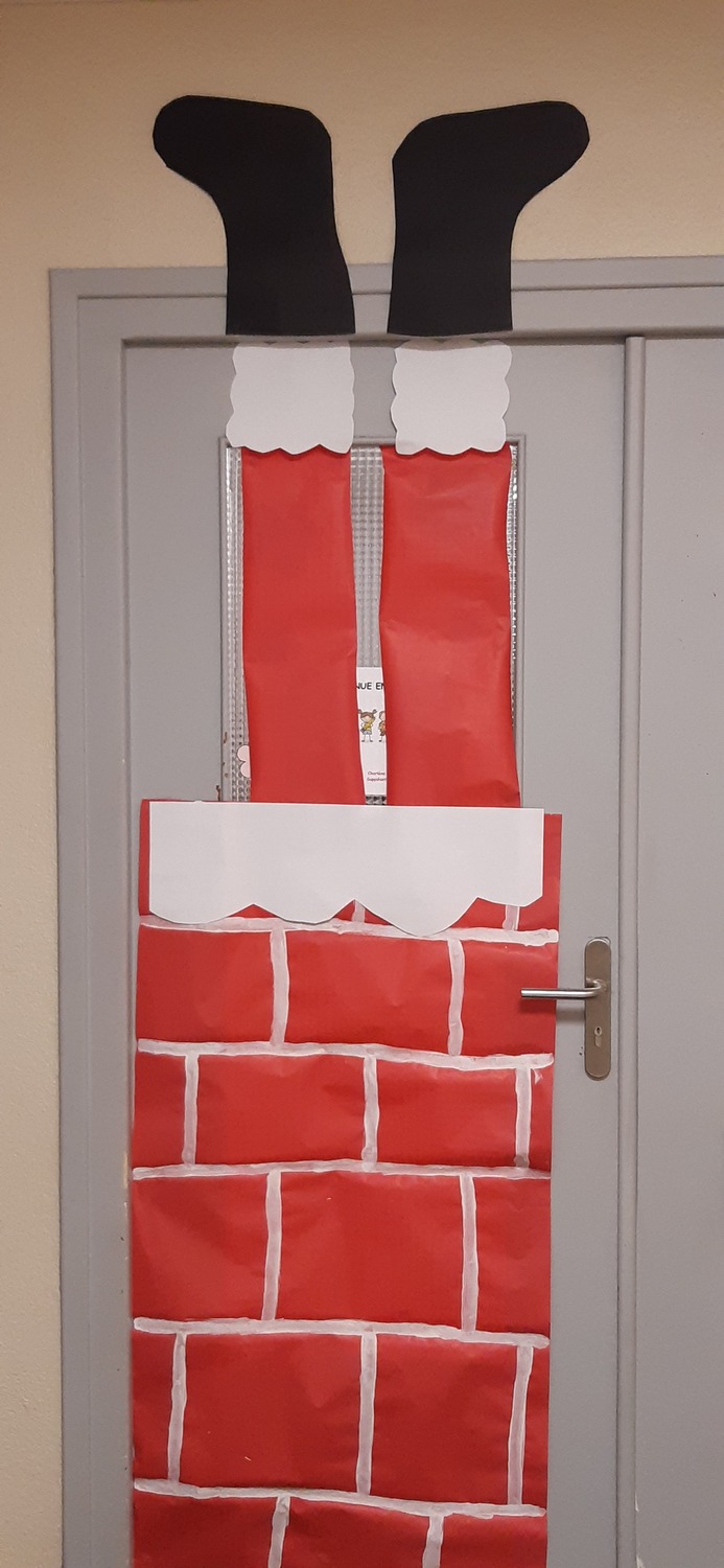 – Un Père Noël ayant « quelques problèmes » orne la porte de la classe :