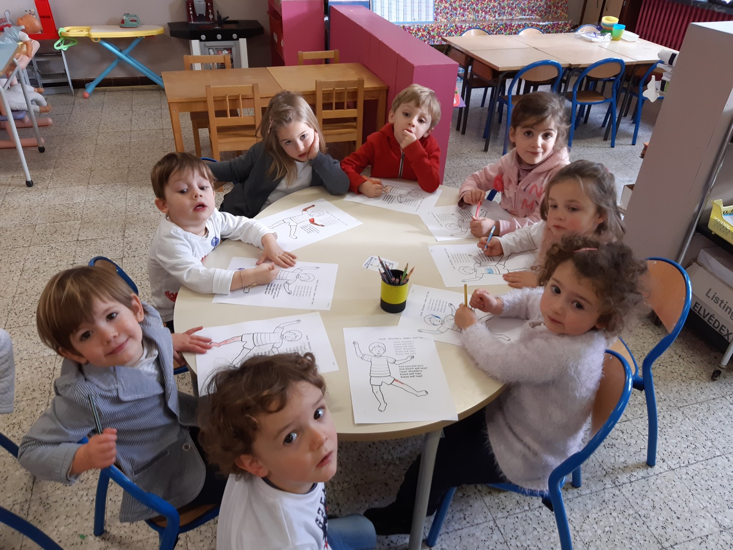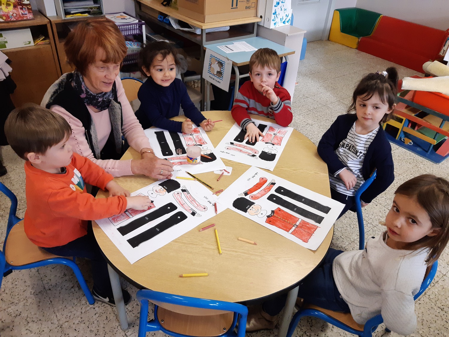 Puis, nous avons fait 3 ateliers : un jeu sur les animaux sur le modèle du « Uno », un bricolage visant à réaliser un pantin d’un garde anglais et deux danses sur les parties du corps humain « Head, shoulders, knees and toes » et « If you’re happy and you know it ».