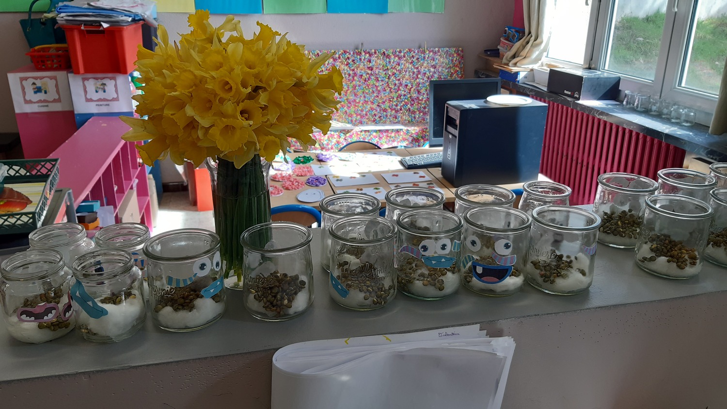 Les élèves ont décoré chacun leur pot de monstres plus rigolos les uns que les autres. Puis ils ont mis du coton au fond de leur pot, ils ont humidifié le coton et enfin ils ont placé les lentilles. Chaque enfant a ainsi pu réaliser sa plantation suite à nos expériences.