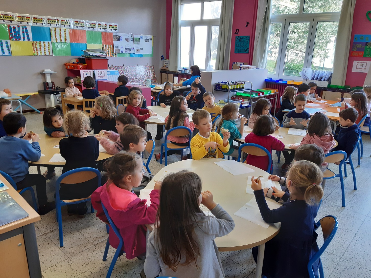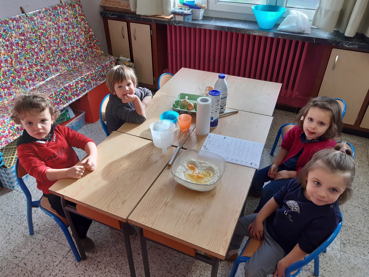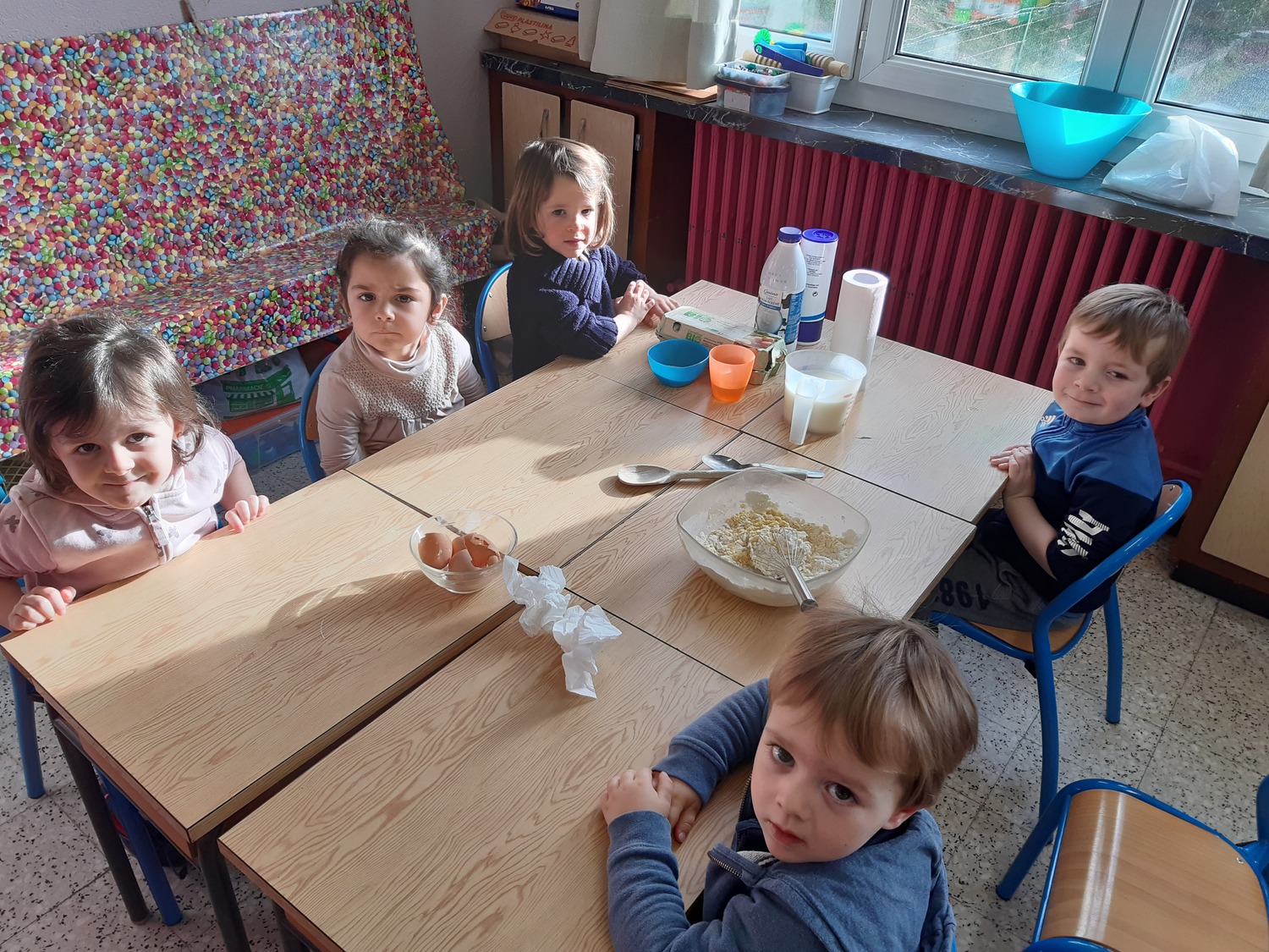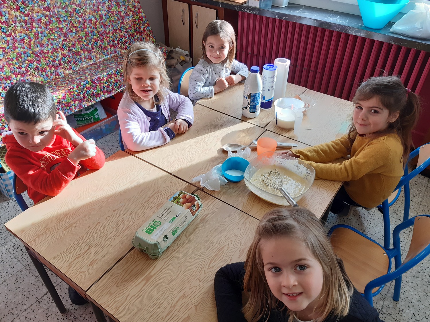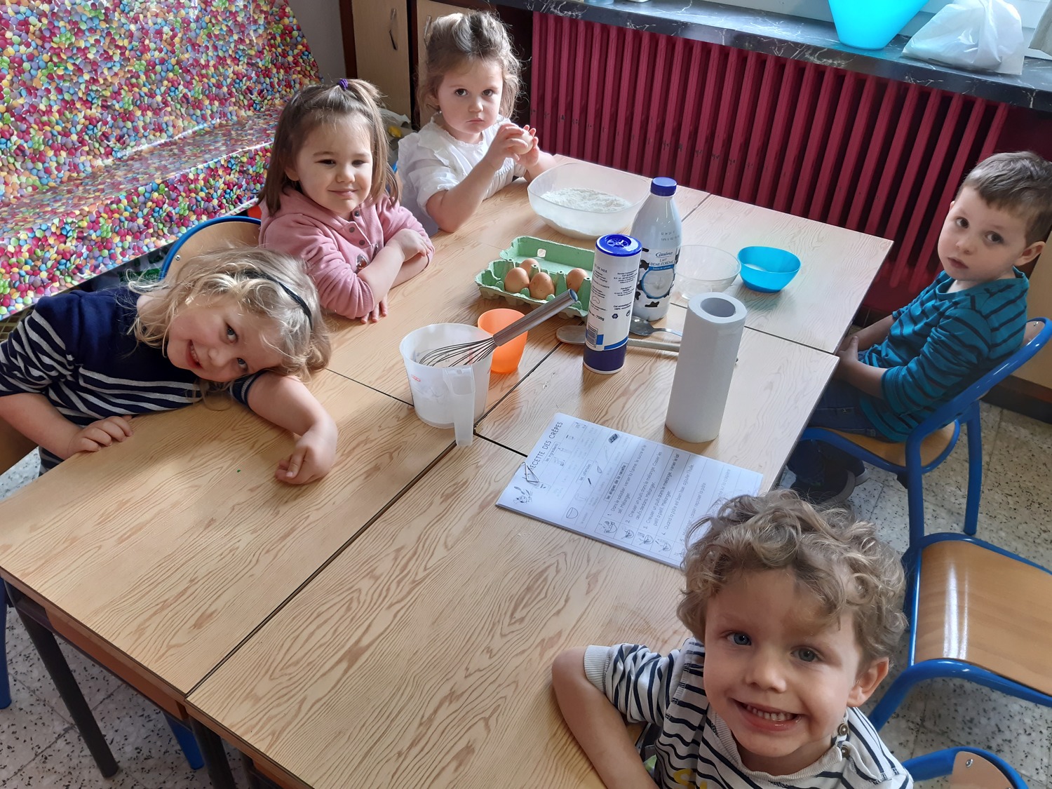Le matin du lundi 3 février, chaque classe de maternelle a préparé sa pâte à crêpes. Tous les élèves ont participé soit en ajoutant les ingrédients, soit en les mélangeant. L’après-midi, les classes de PS/MS et de MS/GS se sont retrouvées pour déguster les fameuses crêpes (nature, au sucre, à la confiture ou au Nutella) ensemble et ainsi partager un moment convivial. Tout le monde s’est régalé !