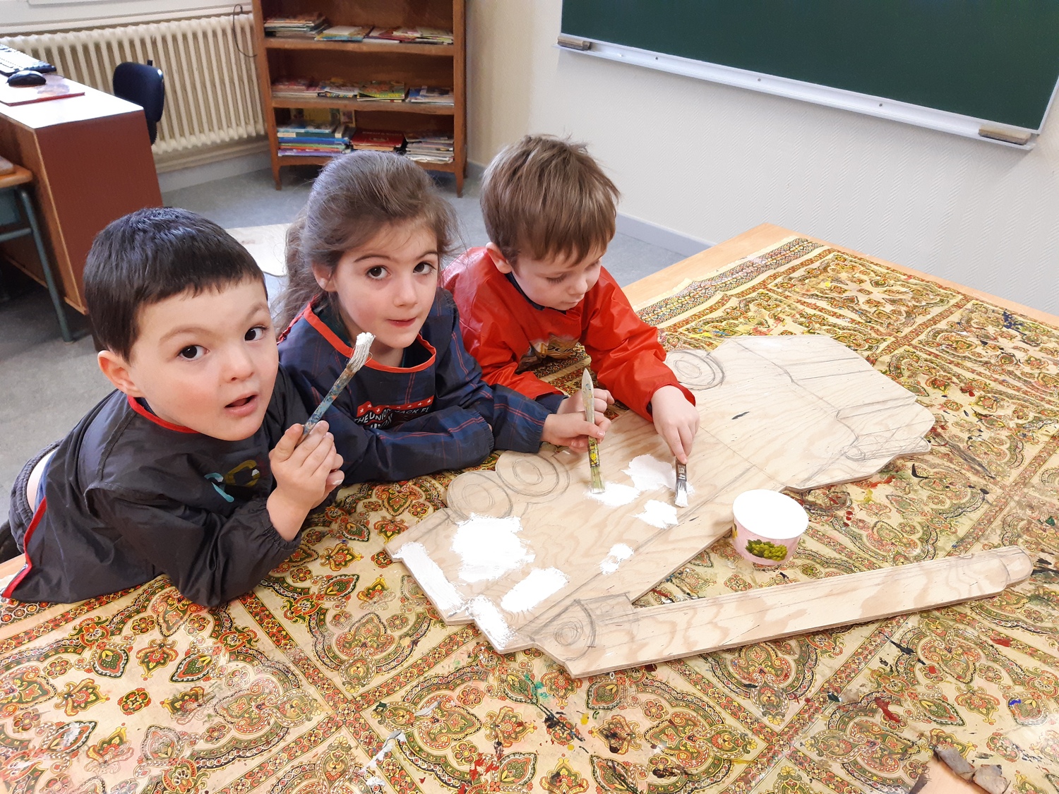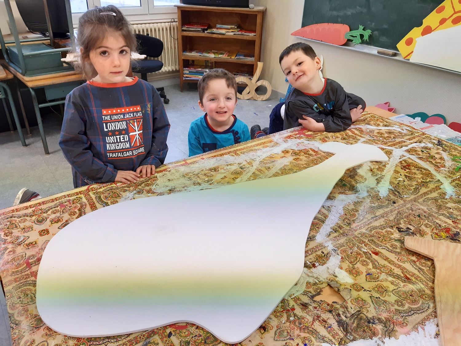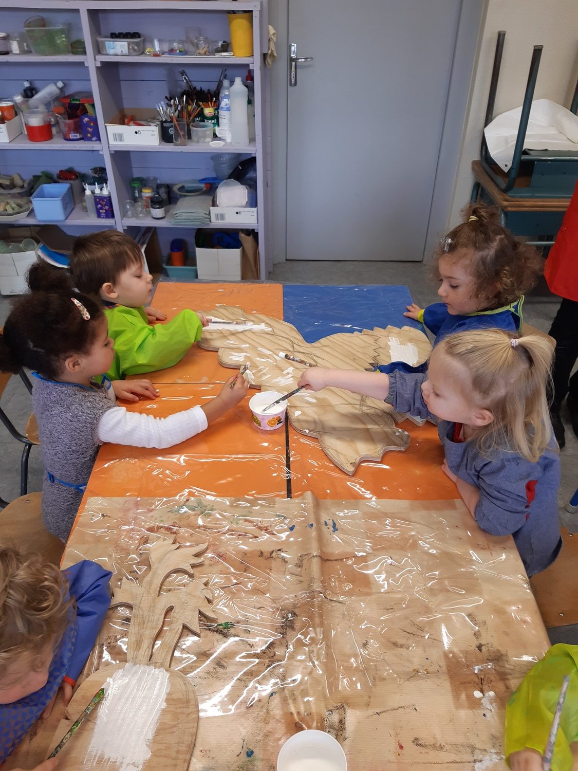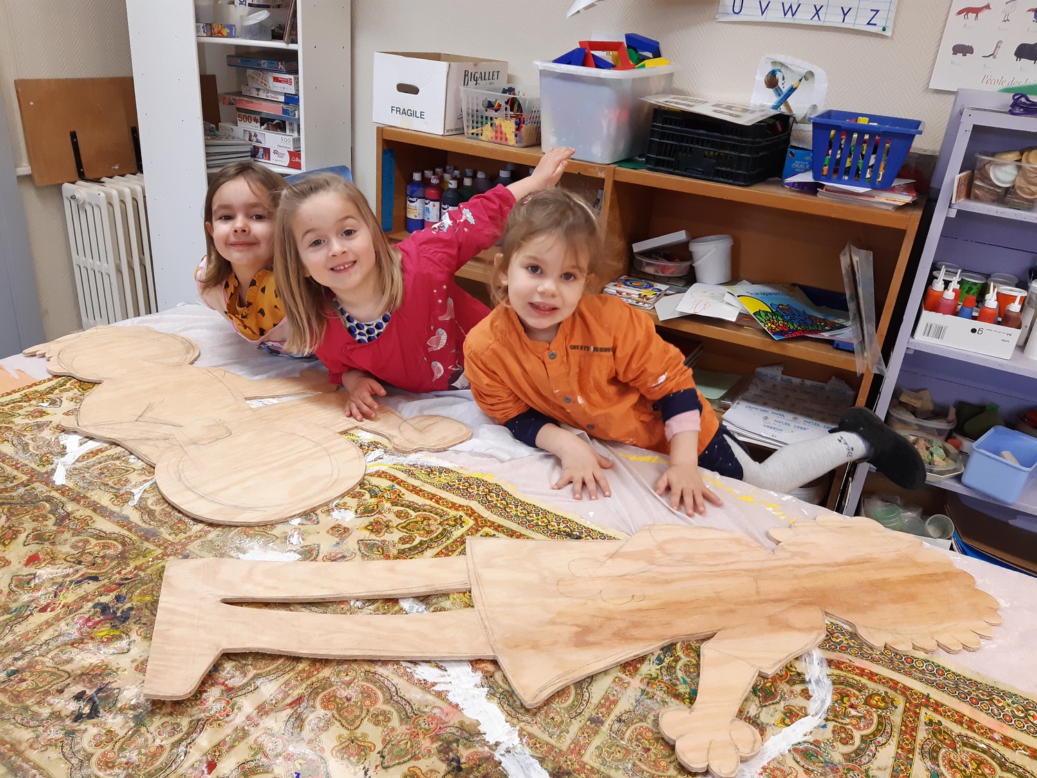 Les lundi 10 et vendredi 14 février, le plasticien Florian POULIN est venu nous proposer des œuvres qu’il a dessinées sur des planches de bois, suite aux différents dessins réalisés par les élèves de l’école sur les Droits de l’Enfant (alimentation, jeux, santé, éducation…). Les élèves de PS1/PS2/MS ont posé la sous-couche permettant ainsi par la suite à la peinture de mieux tenir. À l’issue des 7 séances prévues, une fresque sera ainsi exposée sous le préau de l’école.