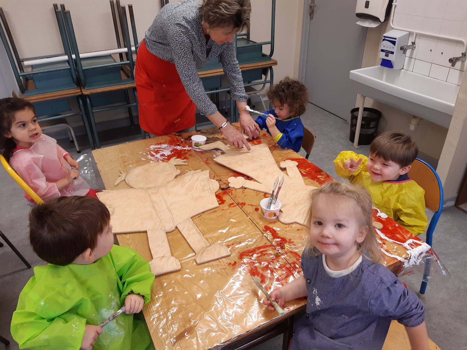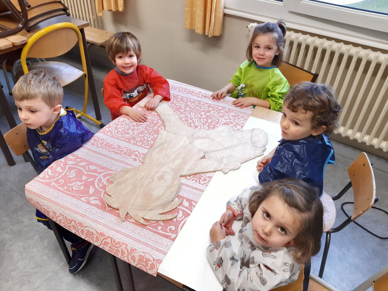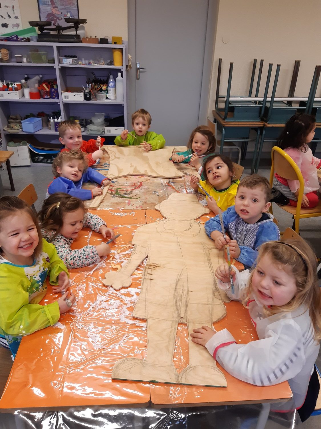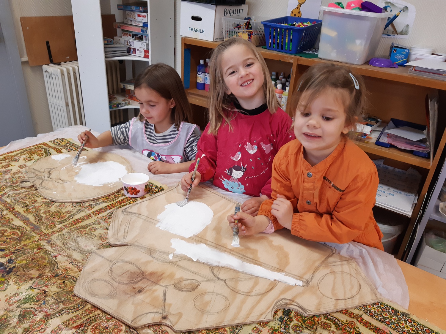 Les lundi 10 et vendredi 14 février, le plasticien Florian POULIN est venu nous proposer des œuvres qu’il a dessinées sur des planches de bois, suite aux différents dessins réalisés par les élèves de l’école sur les Droits de l’Enfant (alimentation, jeux, santé, éducation…). Les élèves de PS1/PS2/MS ont posé la sous-couche permettant ainsi par la suite à la peinture de mieux tenir. À l’issue des 7 séances prévues, une fresque sera ainsi exposée sous le préau de l’école.