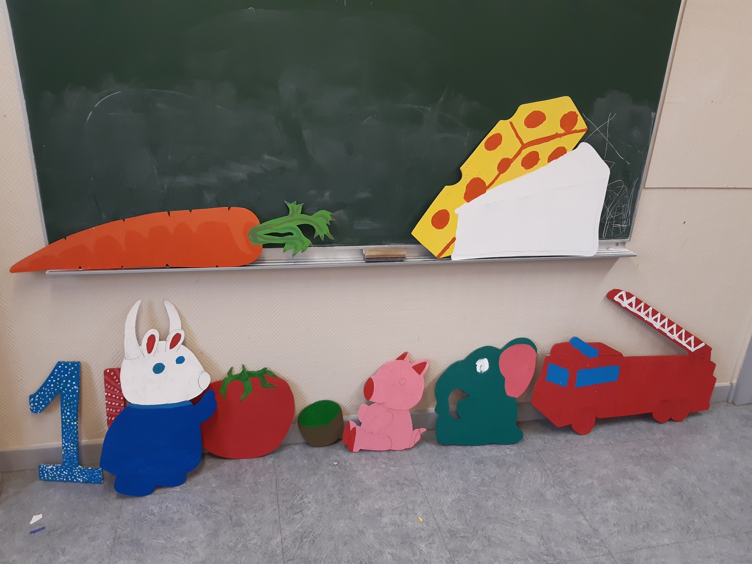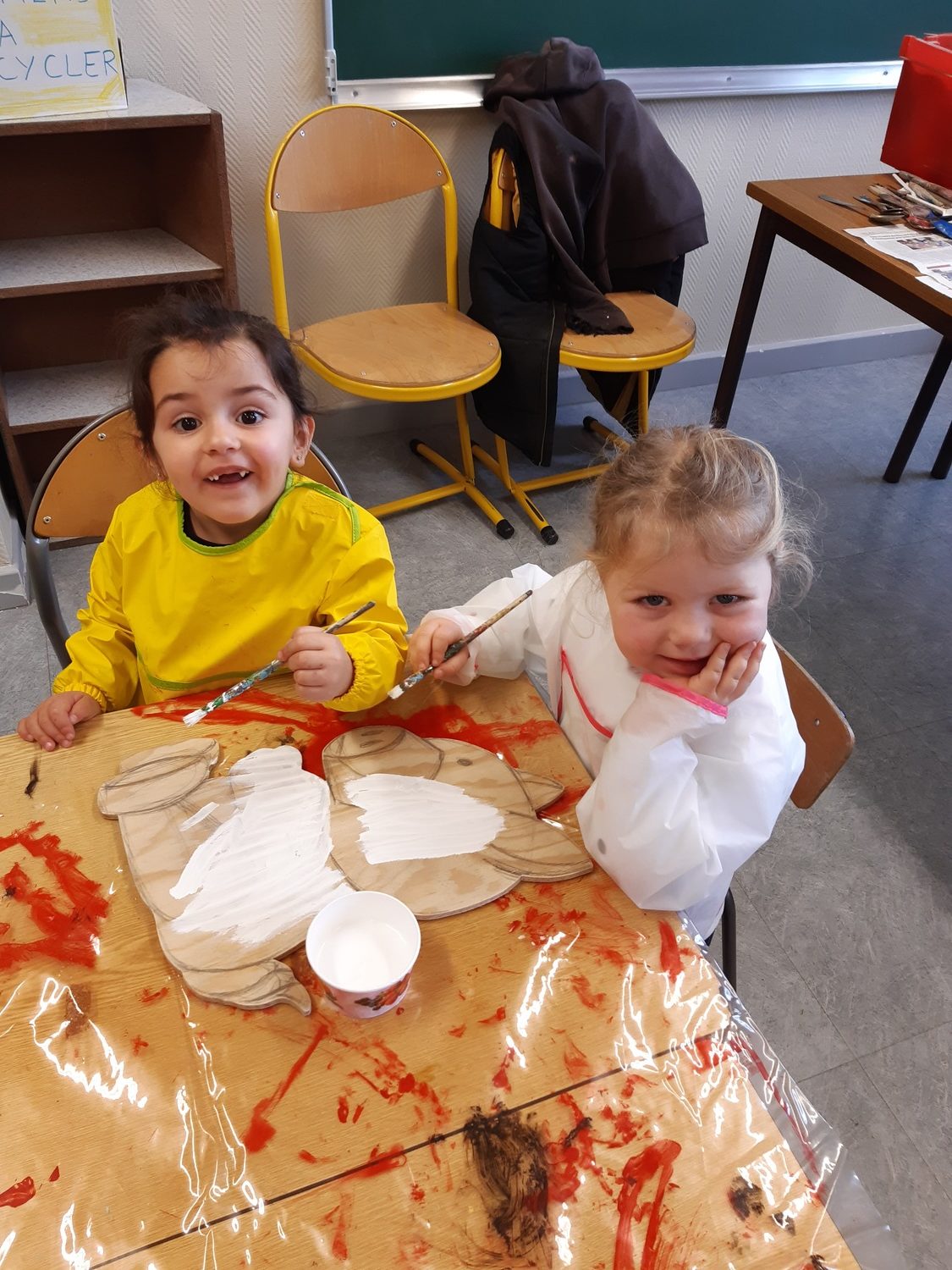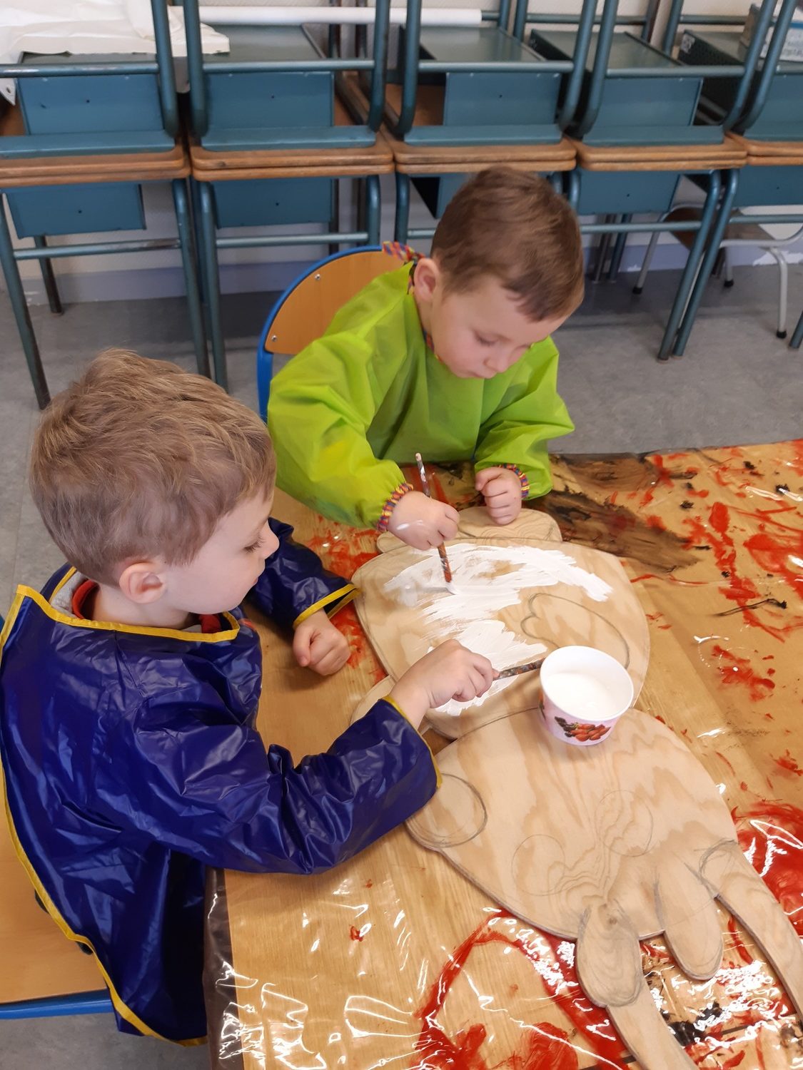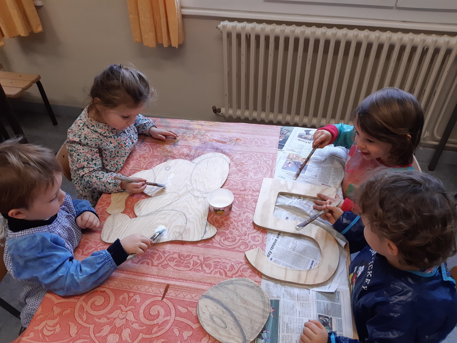 Les lundi 10 et vendredi 14 février, le plasticien Florian POULIN est venu nous proposer des œuvres qu’il a dessinées sur des planches de bois, suite aux différents dessins réalisés par les élèves de l’école sur les Droits de l’Enfant (alimentation, jeux, santé, éducation…). Les élèves de PS1/PS2/MS ont posé la sous-couche permettant ainsi par la suite à la peinture de mieux tenir. À l’issue des 7 séances prévues, une fresque sera ainsi exposée sous le préau de l’école.