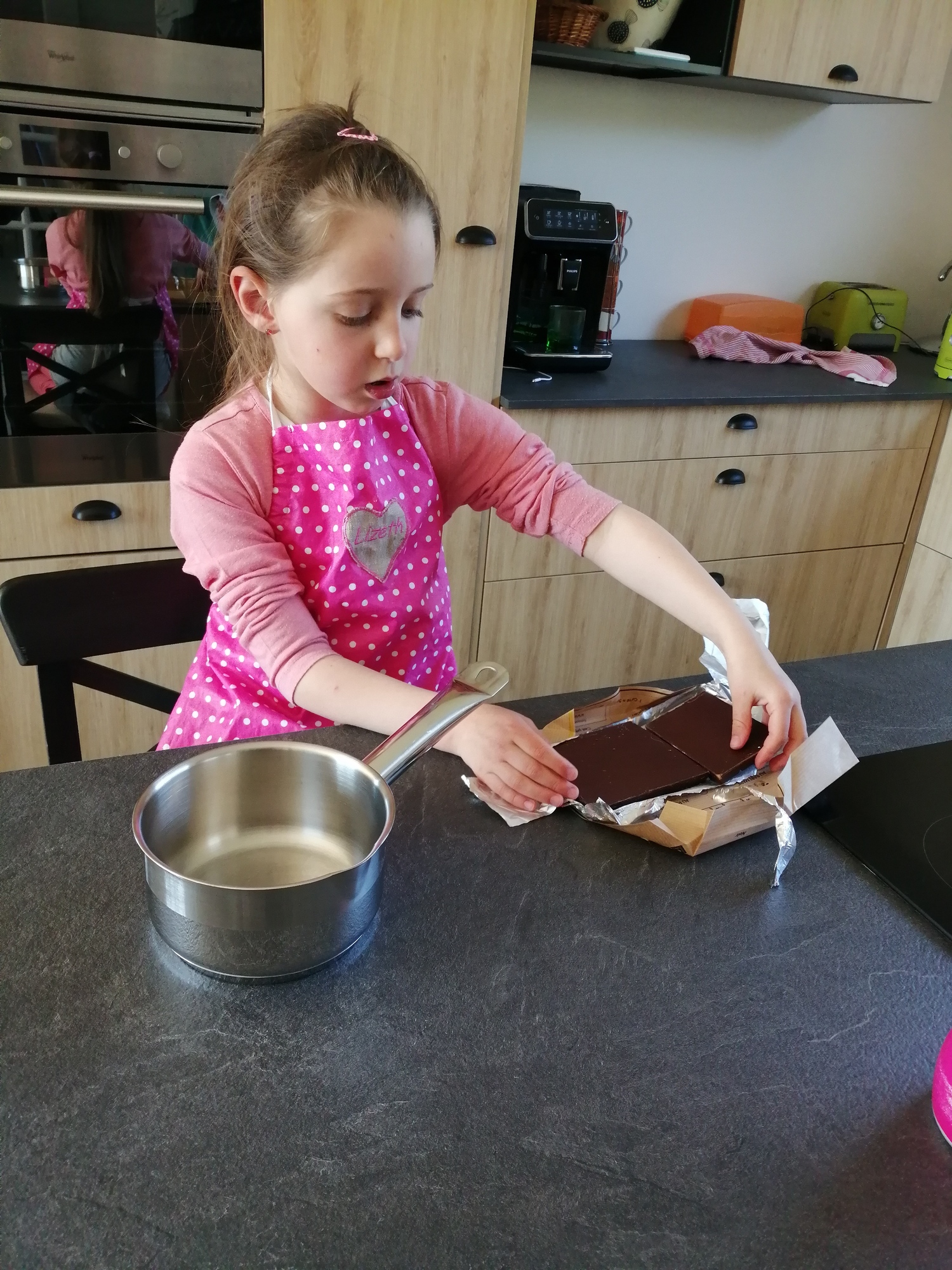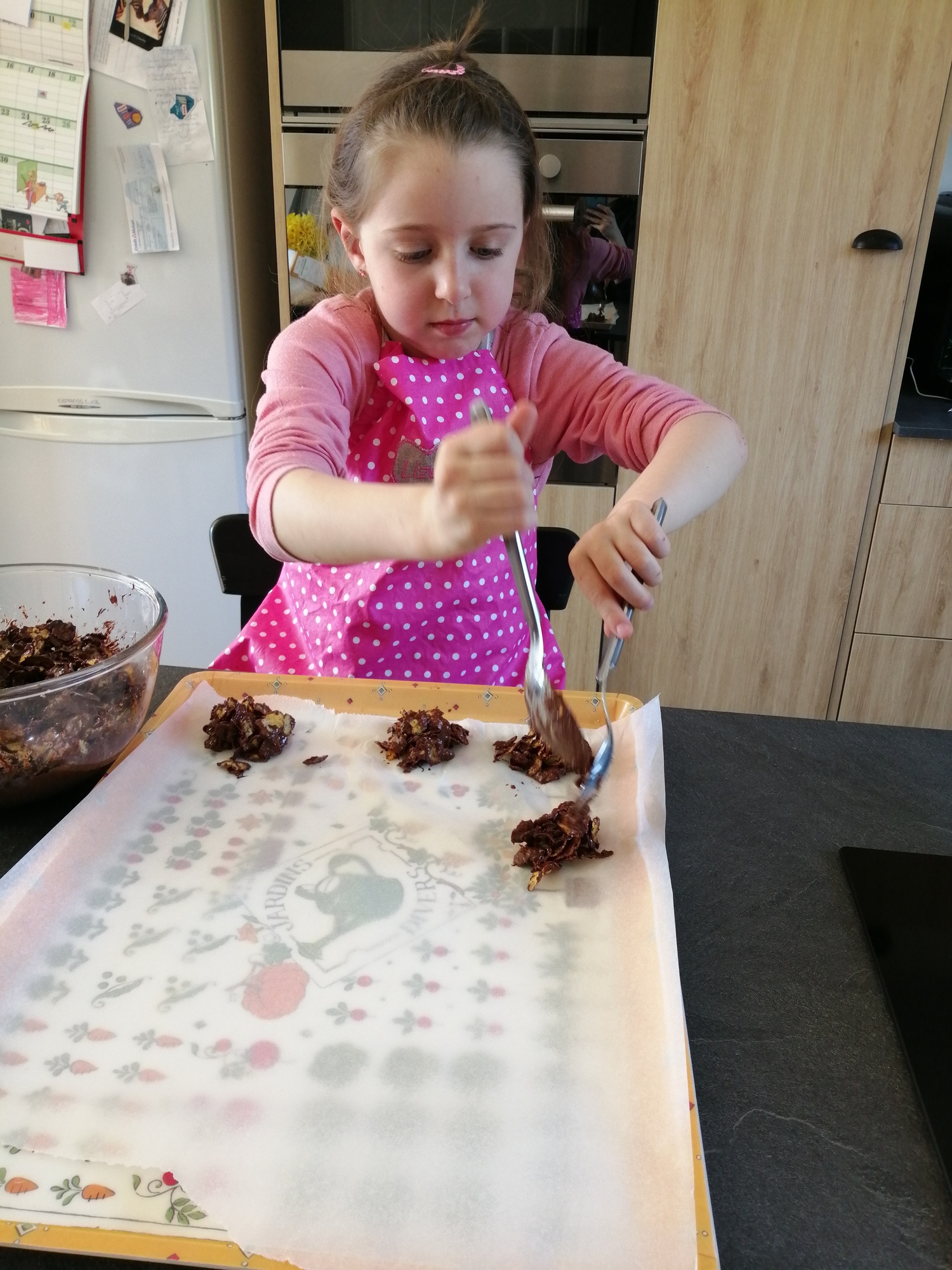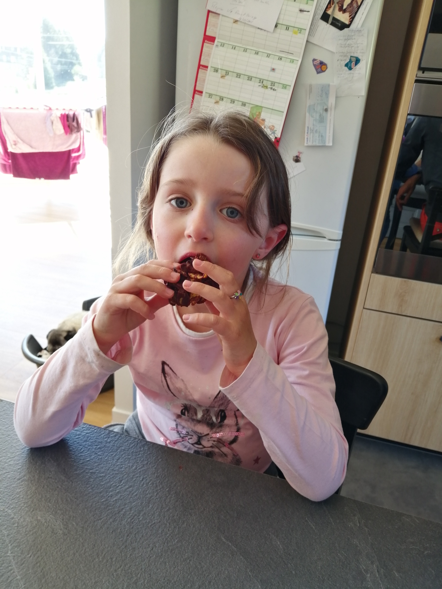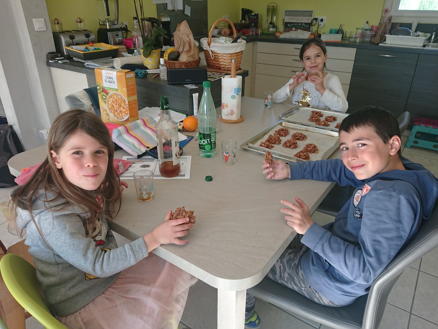 Camille, Amélie et Mathias se régalent avec la recette “Les roses des sables” envoyée par la maîtresse,